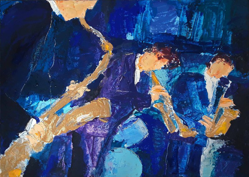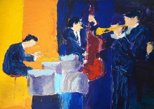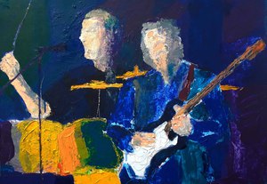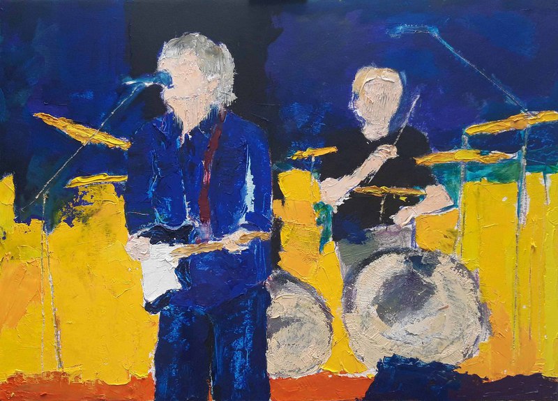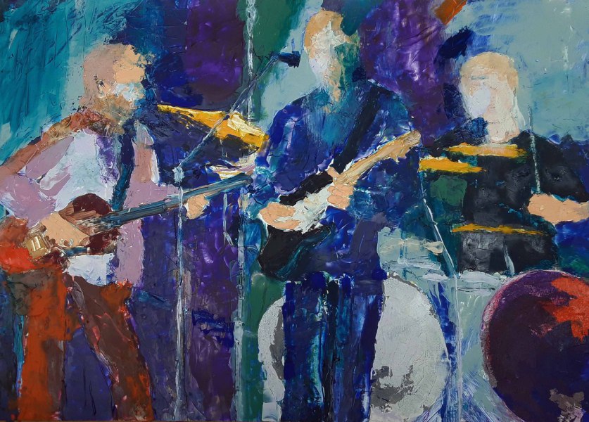Les musiciens (Cream), 2023, Acrylfarbe, Ölfarbe, Ölkreide auf Karton, 72 cm x 102 cm