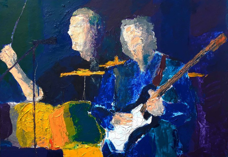 Johannes Brahms, Concerto pour violon, violoncelle et orchestre en la mineur, opus 102, 2024, acrylique, huile et collage sur toile, 70 x 100 cm
