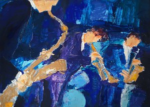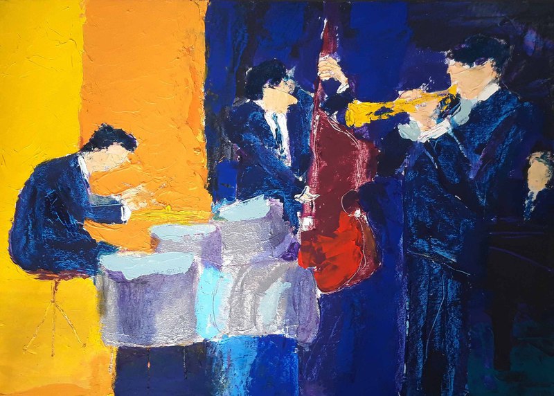 “L’engouement de Nicolas de Staël pour la musique vire … à la passion. Classique, modern, jazz: il ne dédaigne aucune de ses déclinaisons et l’on trouvera dans son oeuvre aussi bien des pianos que des trompettes, comme dans son homage à Sidney Bechet, Les Musiciens, 1953.”