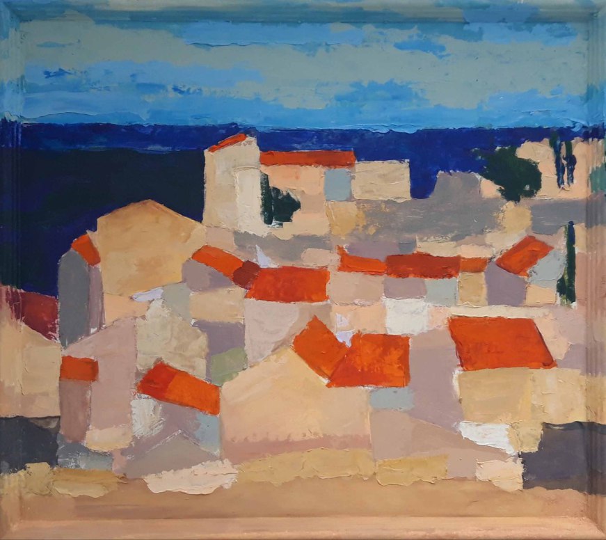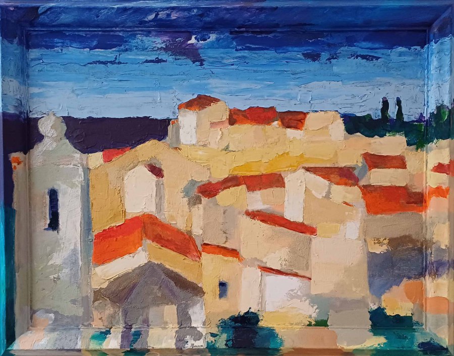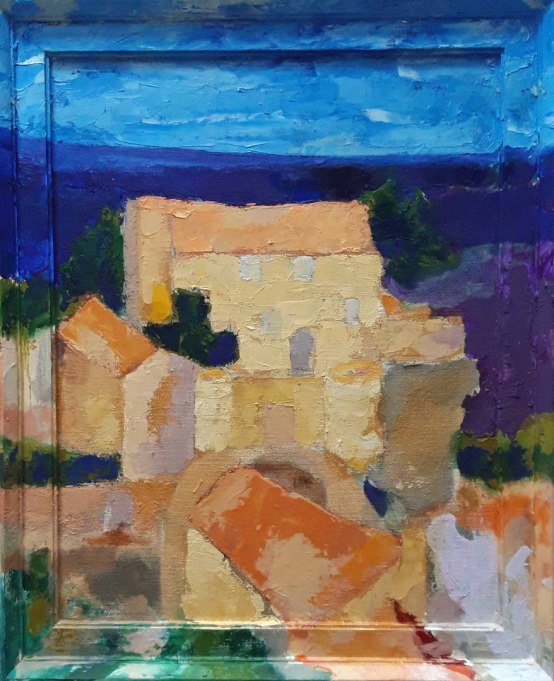 Vue de Lagnes (II), 2023. acrylique, huile sur toile marouflée sur contreplaqué, cadre repeinte,