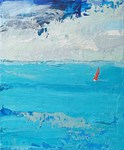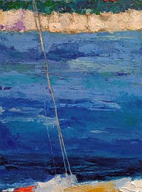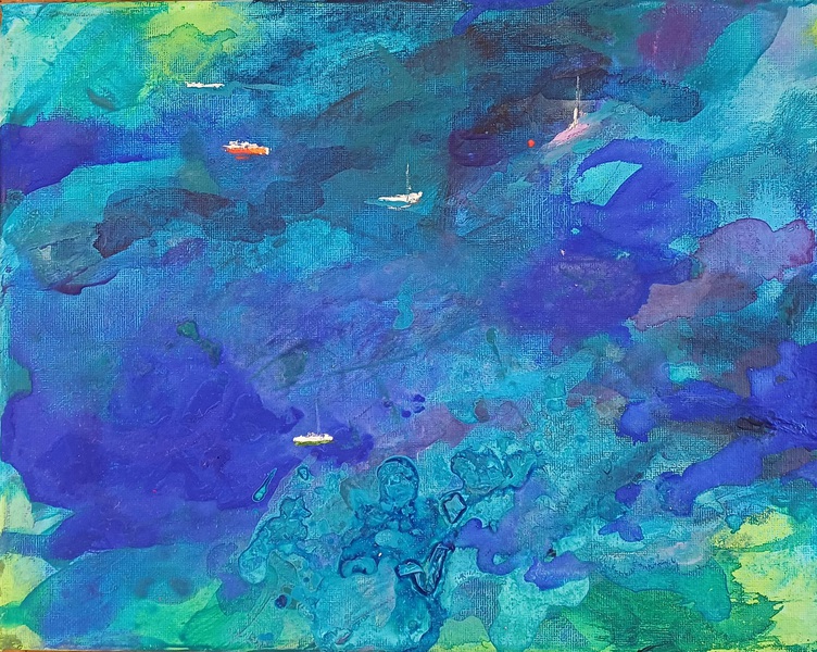 Bateau au large d‘Antibes, 2024, huile, acrylique, collage et grattage sur toile, 100 x 70 cm