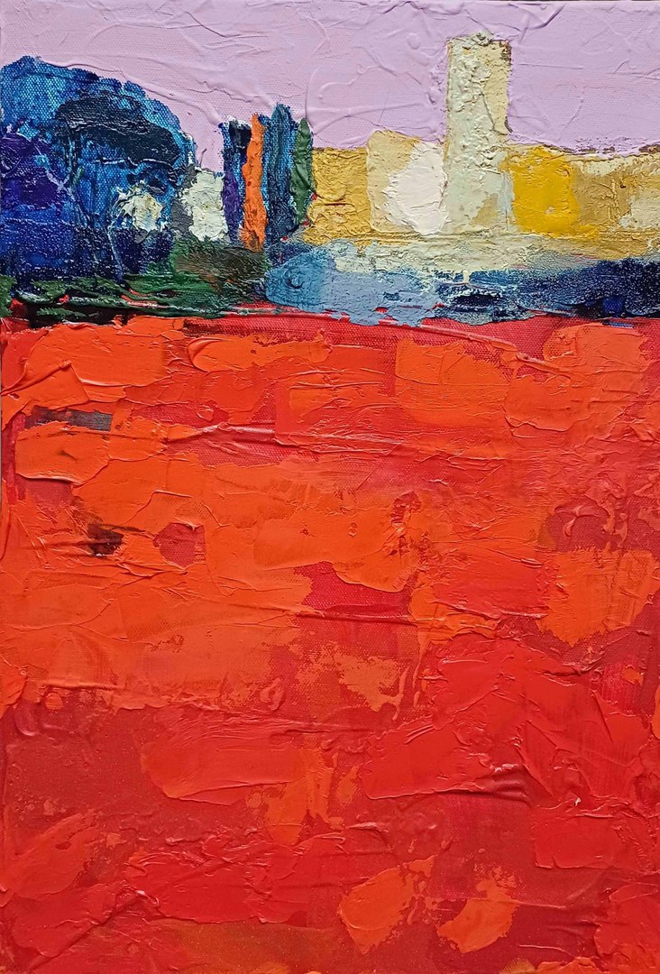 Champ de coquelicots autour de Lagnes, 2023, acrylique, huile sur toile marouflée sur bois,