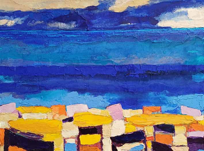 Café sur la plage / Le Lavandou, 2024, huile, acrylique et collage sur toile, 60 cm x 80 cm